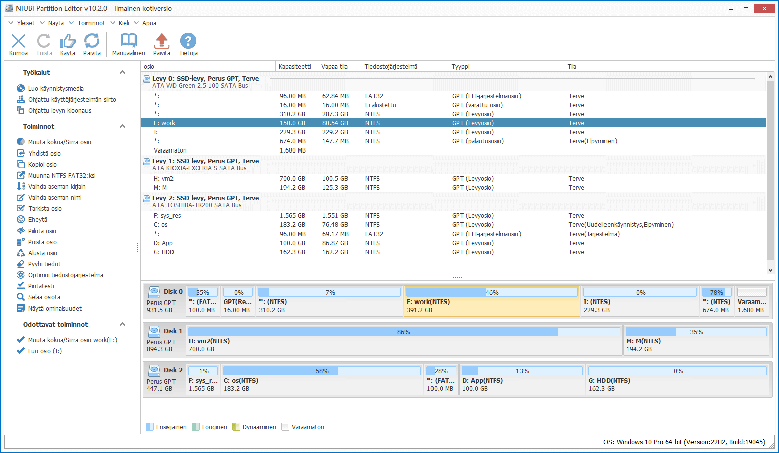 NIUBI Partition Editor Ilmainen versio on ilmainen osioiden hallintaohjelma Windows 11, 10, 8, 7, Vista, XP (sekä 32- että 64-bittinen). Se on 100% ilmainen kotikäyttäjille, 100% puhdas ilman mukana tulevia mainoksia tai laajennuksia.