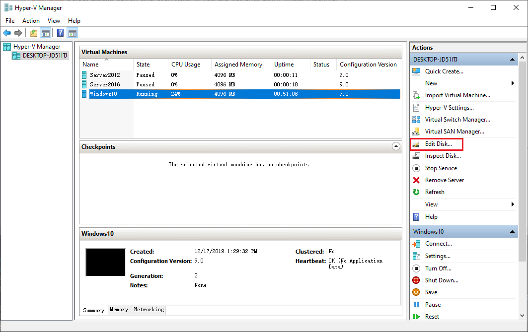 Another way is running Hyper-V Manager, the same with PowerShell, Hyper-V Manager helps expand virtual disk in Windows 10 dynamically without shutting down the guest virtual machine, likewise, you must delete associated Checkpoints firstly.