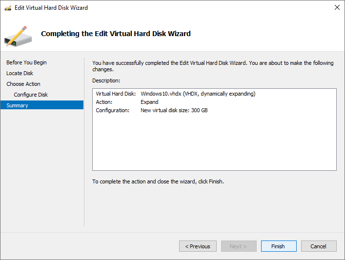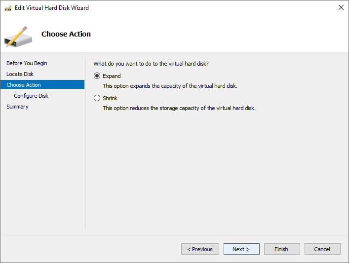 Steps to expand virtual disk with Windows 10 Hyper-V Manager: