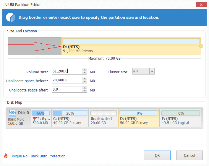 - In the pop-up window, drag the left border towards right, or enter an amount in the box of "Unallocated space before". Then part of free space in drive D will be converted to unallocated behind C: drive.