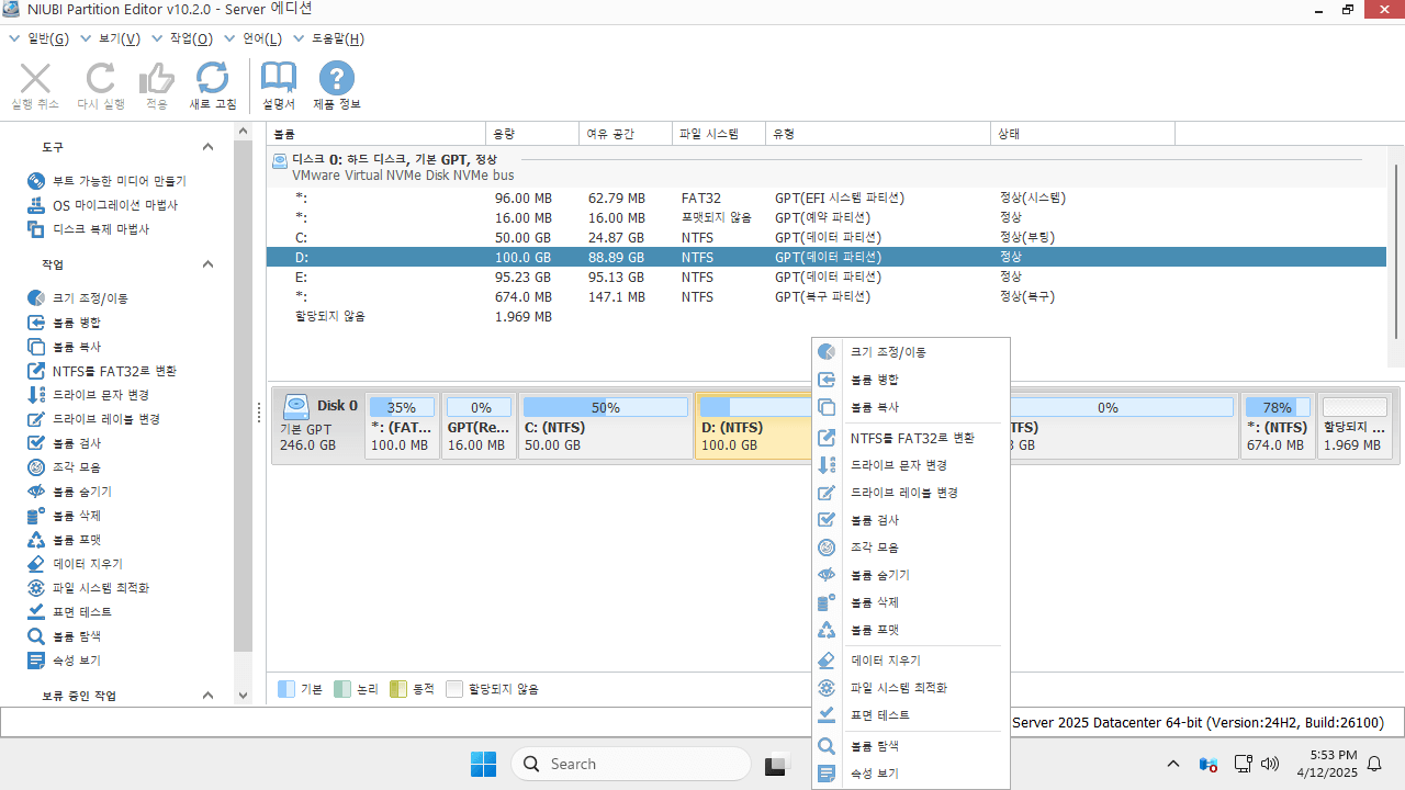 NIUBI Partition Editor 서버 에디션은 중소기업을 위해 설계된 Windows Server용 신뢰할 수 있는 디스크 파티션 소프트웨어입니다. 데이터를 손실하지 않고 할당된 파티션의 크기를 조정하기 위해 파티션을 축소, 확장, 이동 및 병합하는 데 도움이 됩니다. 서버 중단 없이 시스템 및 데이터를 백업하거나 마이그레이션하기 위해 디스크 파티션을 복제합니다. 디스크 파티션 유형 변환, 파티션 생성, 삭제, 포맷, 삭제 및 최적화 등 다양한 기능을 제공합니다.