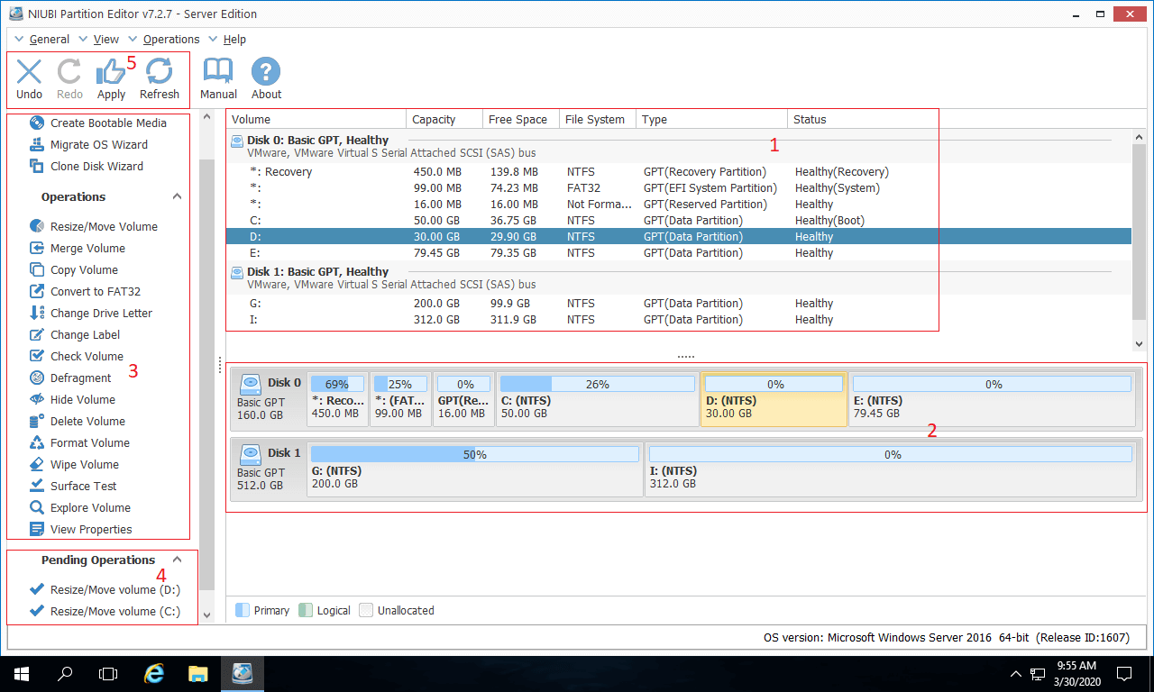 Download this partition manager in Windows 2016 server (physical or virtual machine), you'll see the main window with 5 sections.