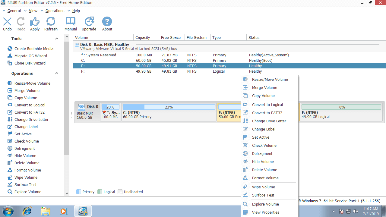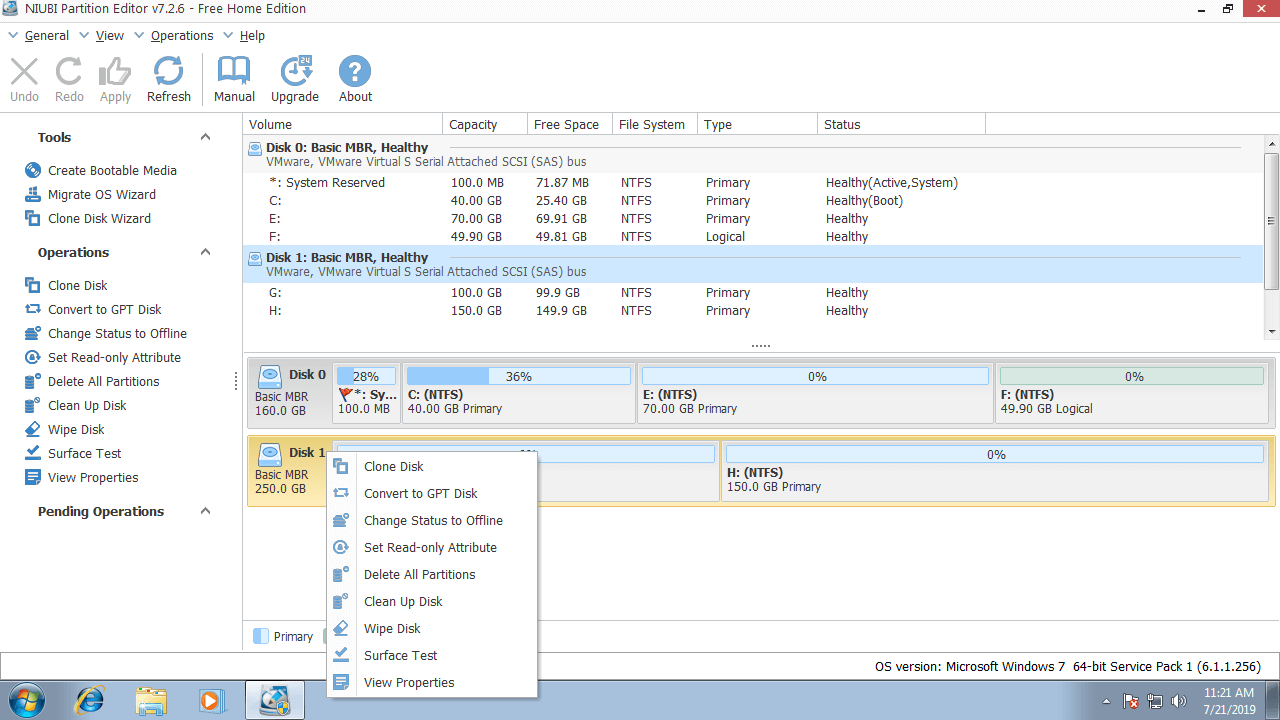 - All available operations to selected disk or partition, unavailable operations are hidden automatically.