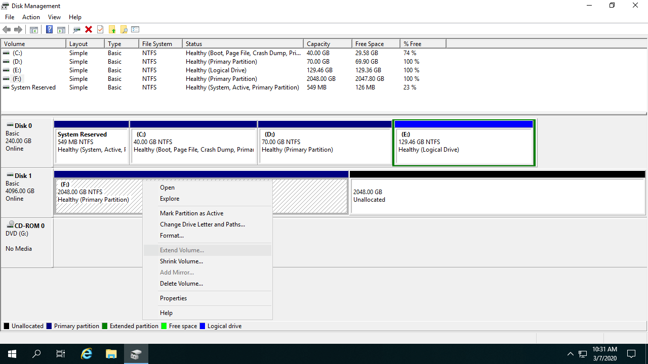 If you use a 2TB+ MBR disk, there's another possible reason why Disk Management is unable to extend volume in Windows 10/8/7. If you initialize a 4TB hard disk as MBR, you can only use 2TB space, the remaining space will be shown as Unallocated. When you right click this Unallocated space, all options are grayed out.
