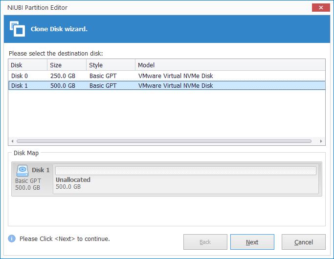 - Select the Unallocated space in destination disk and click Next.