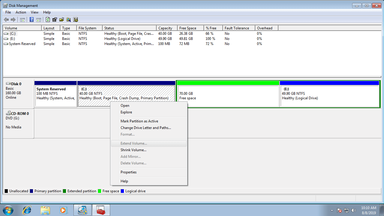 As the screen shot shows, Extend Volume greyed out for both C and E drive after shrinking D. This is because: