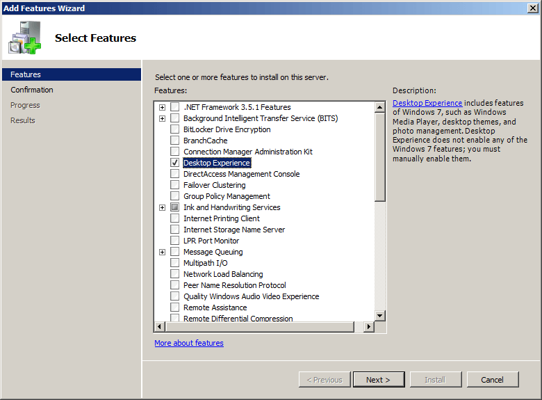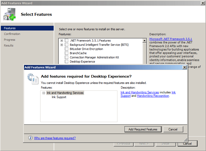 Step 3: Click the check-box in front of "Desktop Experience". Add Features Wizard will ask you to install Ink and Handwritting Services if you have not previously installed, click "Add Required Features".
