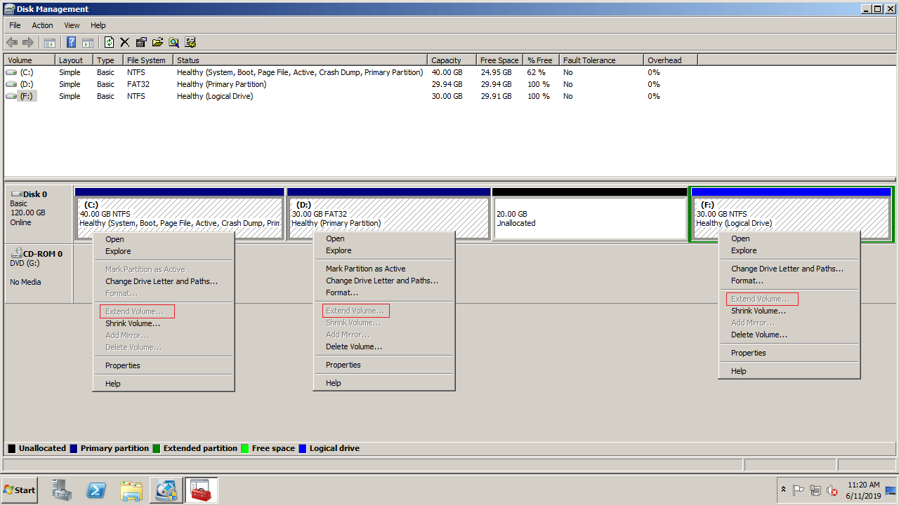 In my server, Extend Volume is disabled for all disk partitions, because: