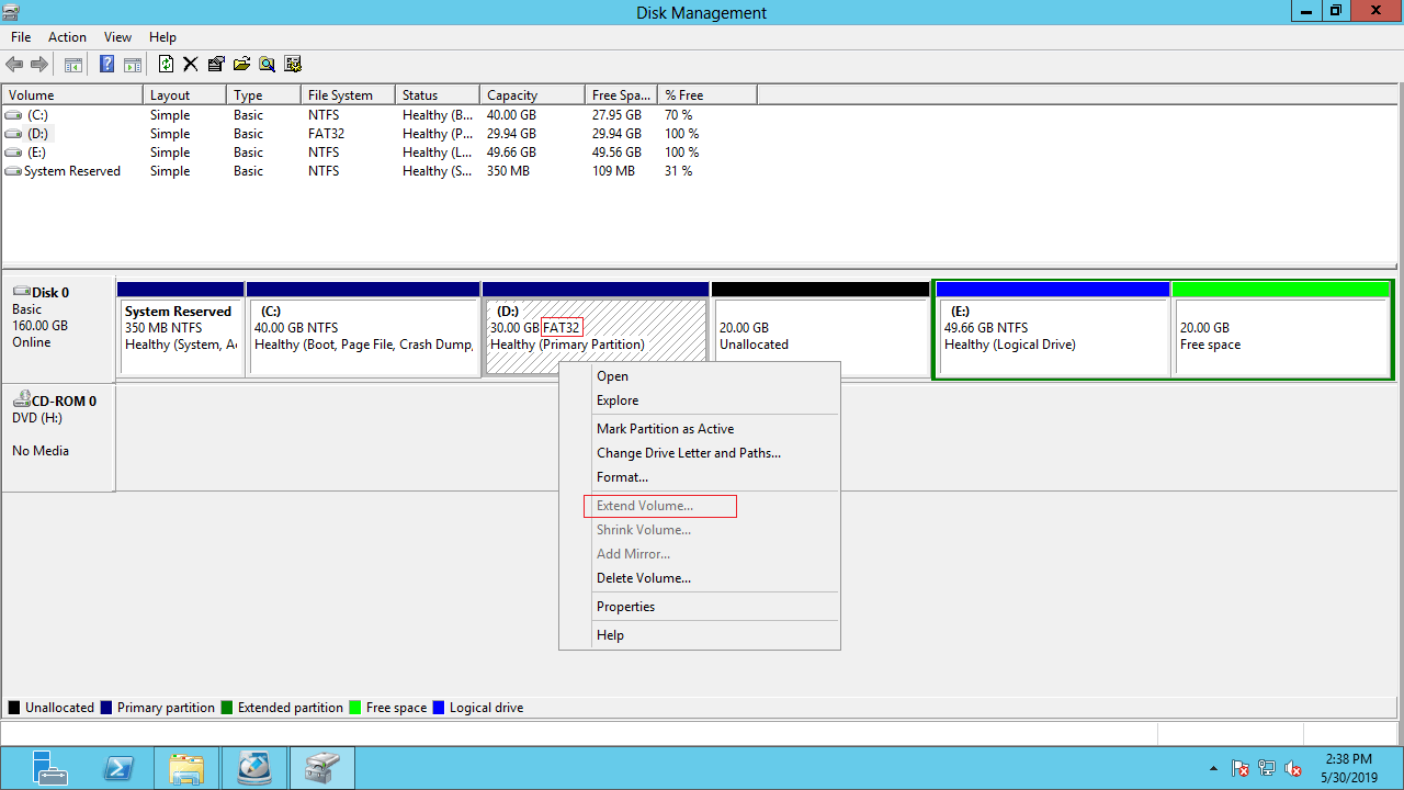 Another reason why the Extend Volume option is disabled for drives D or E is that the partition type may not be supported by Disk Management.