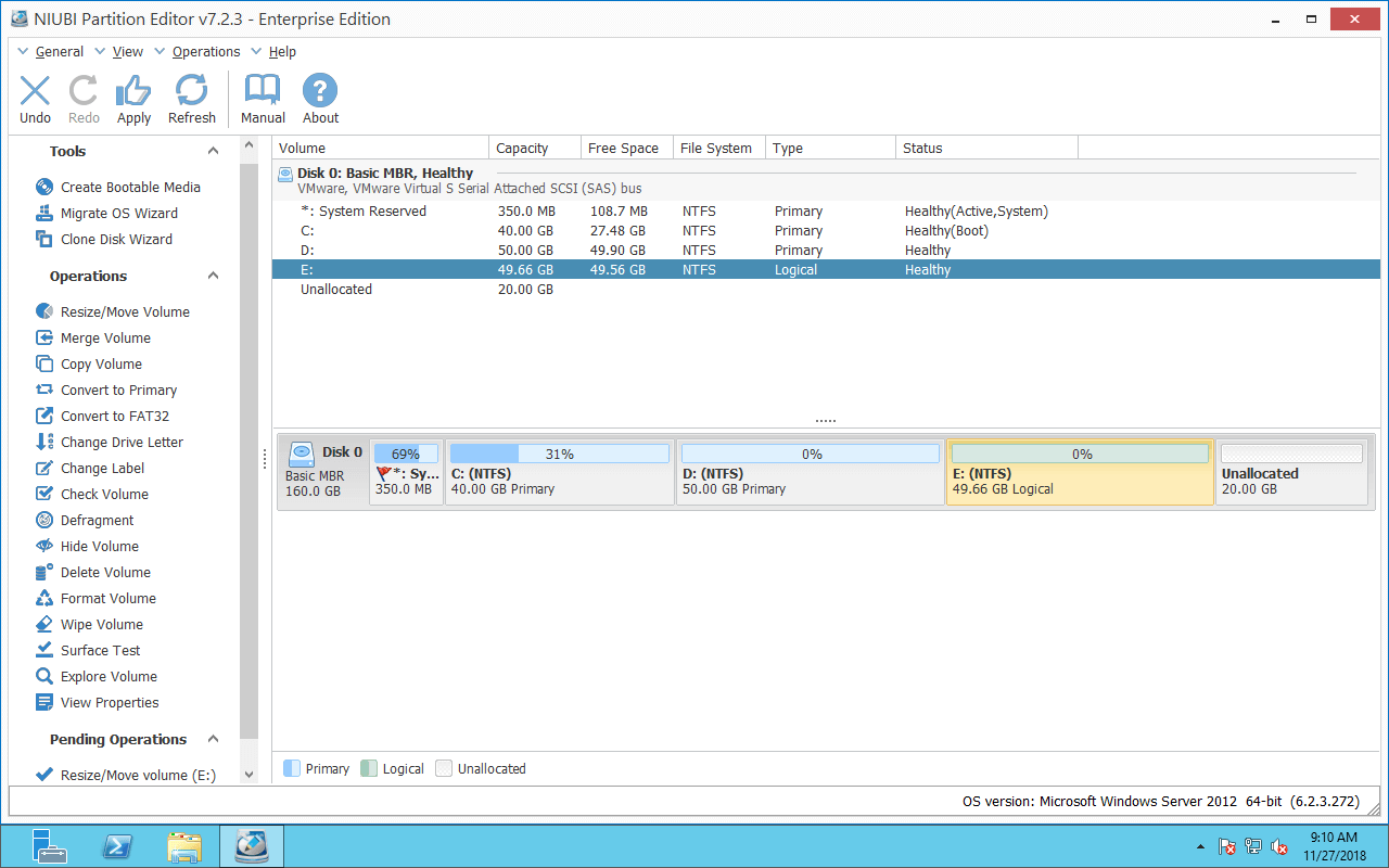 After running the server for a period of time, sometimes you need to move partition. For example, you cannot extend C drive in Server 2012 with Disk Management after shrinking D or E drive. To solve this problem, you need to move partition D/E to the right and make unallocated space adjacent to C drive. If all these partitions are getting full, you can move a volume to another disk, then delete it and add its disk space to C drive. In some servers, there's Recovery or EFI partition in the middle of C and D drive. This article introduces how to move partition in Windows Server 2012 R2 with safe partition software.