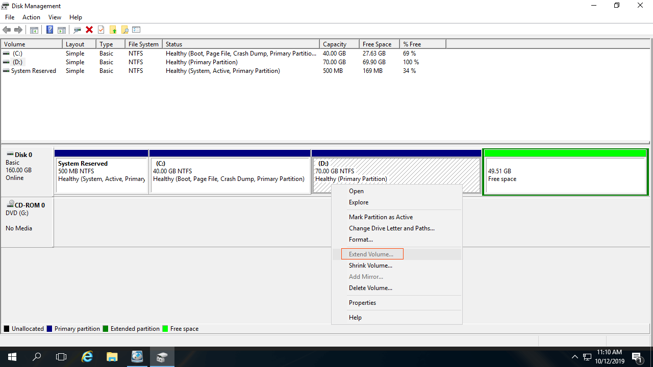 Steps when you can't extend volume in Windows Server 2016 after shrinking: