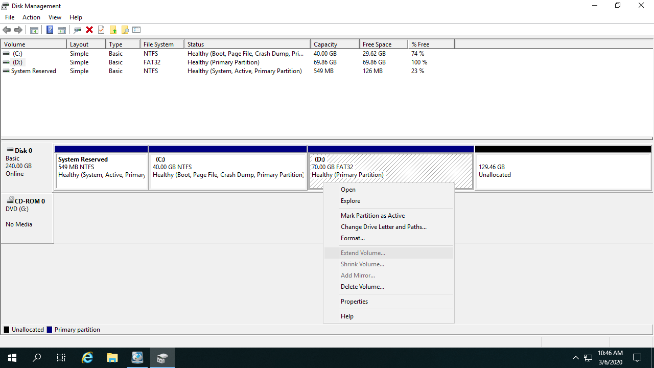 Disk Management can only extend the partitions that are formatted with NTFS file system or without file system (RAW). FAT32 and any other types of partitions can't be extended. As you see in the screenshot, I cannot extend volume D, although there's contiguous unallocated space on the right, because it is a FAT32 partition. This is the second common reason why can't extend volume in Server 2019 Disk Management.