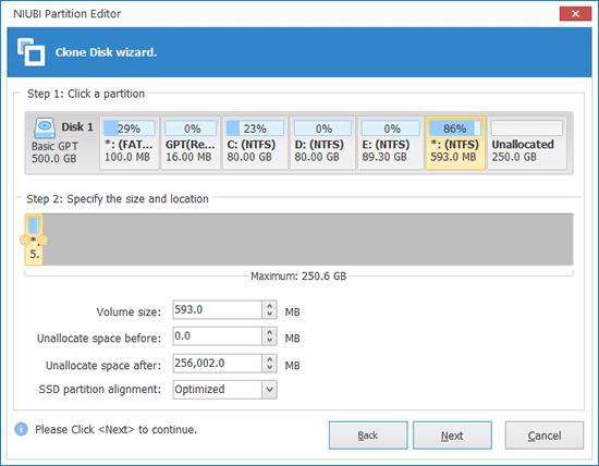 - Edit the size and location of partitions on destination disk. Start from the last one. Drag either border of a partition, then you can shrink or extend this partition. Drag the middle of this partition, then you can move it with adjacent Unallocated space.