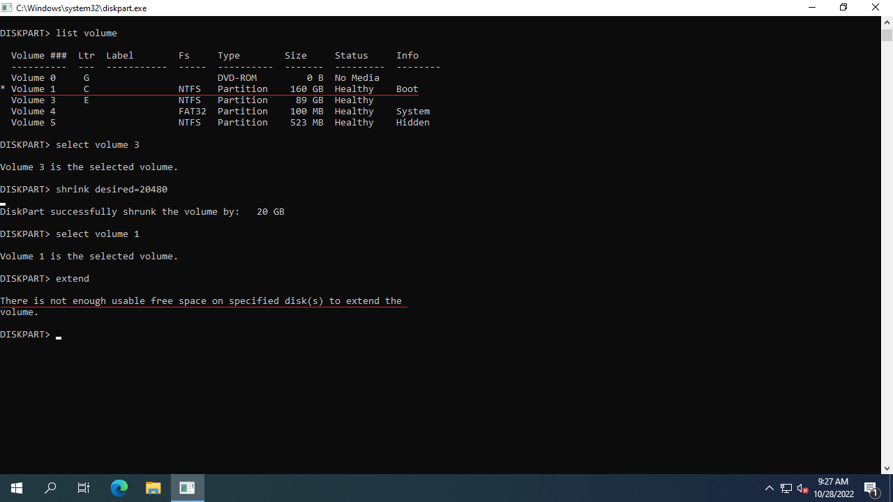 There's "shrink" command, why not shrinking the contiguous D drive to extend partition C? When shrinking D or any other partition with diskpart command, unallocated space is made on the right side. Therefore, this unallocated space is always nonadjacent to C drive. Diskpart "extend" command can only extend NTFS partition when there is adjacent unallocated space on the right. If you shrink partition D to extend C drive via diskpart, you'll get error message "There is not enough usable free space on the specified disk(s) to extend the volume".