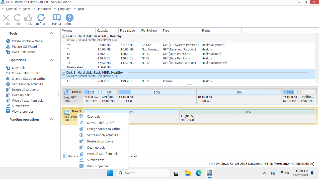 A hard disk drive is an indispensable component of a server. Before saving files to a brand-new disk, you must initialize the disk, create partitions on it, and format the partitions with a filesystem. After using the server for some time, you may need to clone the disk to a larger one, convert the disk partition type, as well as resize and move partitions. To accomplish these tasks, a disk partition management tool is required. Like other versions, Windows Server 2025 has "Disk Management" to perform some basic operations. However, if you need to clone, convert, move, or resize partitions without restrictions, reliable server disk management software can help you. This article explains the built-in Disk Management on Windows Server 2025 and the best disk partition software for Windows servers.