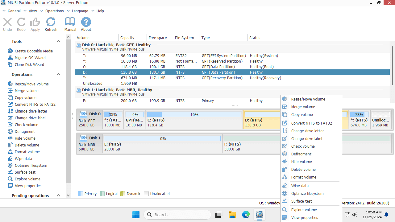 Download NIUBI Partition Editor, and you'll see all storage devices, along with their partition layouts and detailed information in the main window. Right click a partition or the front of a disk, and you'll see available operations.